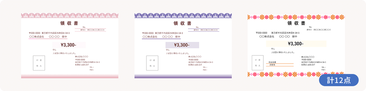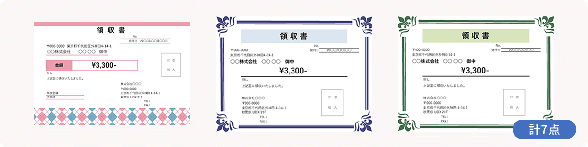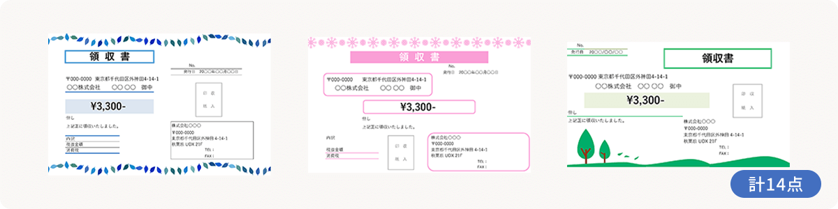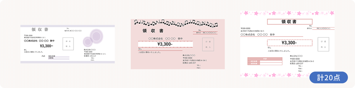 かわいくて遊び心のある星柄やクローバー柄、上品なレース模様、リズム感のある音符柄など、イラストをアクセントに使ったテンプレートです。業種やサービスのイメージに合わせて選ぶことで、領収書に親しみやすさや温かな印象を込めることができます。