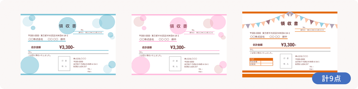 シャボン玉を思わせる大ぶりな水玉模様や、イベント・パーティーの万国旗のようなフラッグをモチーフにしたデザインの領収書です。カラーバリエーションも豊富で、カジュアルで目を引くテンプレートなので、雑貨店やイベント出店など楽しさを演出したいシーンにぴったりです。