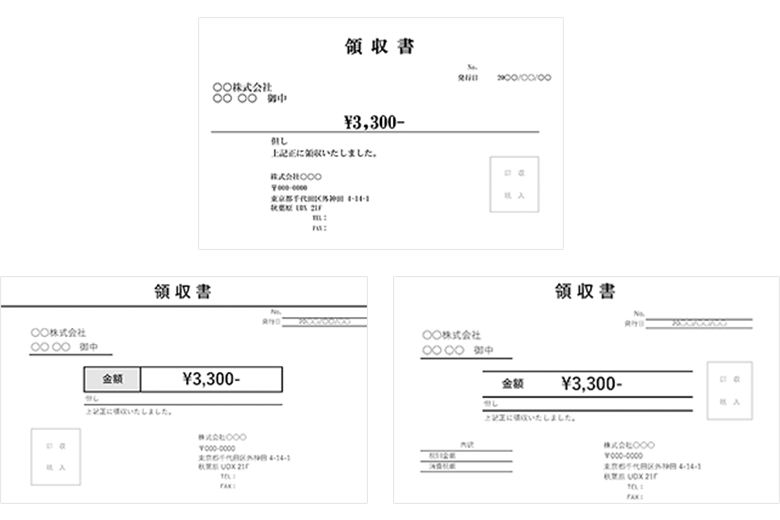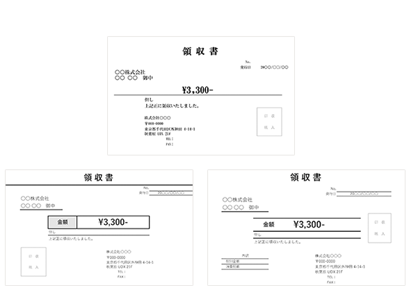 どんな業種やサービスでもシーンを選ばず使いやすい、定番の領収書フォーマットが揃っています。モノトーンを基調とした見やすいレイアウトで、しっかりとした実務的な印象を与えるデザインが特徴です。装飾性を省き必要な情報をすっきりとまとめたもの、金額部分をやや強調したものなどバリエーションも豊富で、幅広く使える汎用性が魅力です。