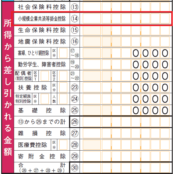 確定申告書 第一表の「所得から差し引かれる金額」欄の中にある「小規模企業共済等掛金控除(14)」欄に、第二表の「支払保険料等の計」に記載した、その年に支払ったiDeCoの掛金の総額を転記します。