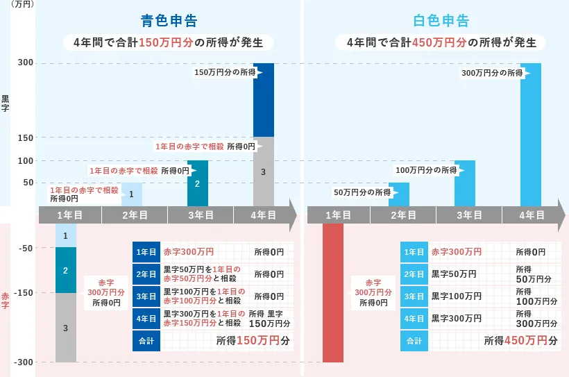 1年目は赤字なので、所得税は0円。2年目は50万円-300万円=▲250万円で、2年目も所得は0円となり所得税は0円。3年目は2年目に相殺しきれなかった赤字分250万円があるので、100万円-250万円=▲150万円で、3年目も所得は0円となり所得税は0円。そして、4年目は3年目にも相殺できなかった150万円の繰り越しがあるので、300万円-150万円=150万円でこの150万円にだけ所得税がかかります。