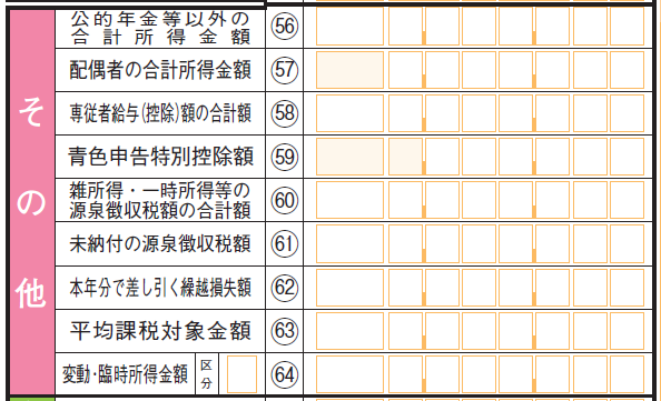 収支内訳書への記載を行ったら、確定申告書 第一表「その他」欄の「専従者給与(控除)額の合計額(58)」を記載します。収支内訳書に記載した控除額の合計額を転記してください。