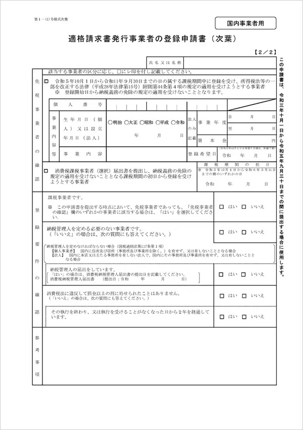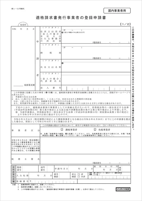 適格請求書発行事業者の登録申請は、書面でも可能です。その場合は、国税庁のWebサイトから申請書をダウンロードし、必要事項を記入します。申請書は2枚あります。記入漏れ、送付忘れなどないよう注意しましょう。