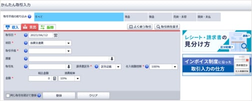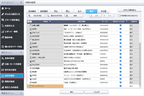 [科目の設定]には一般的な勘定科目が予め登録されていますが、必要に応じて勘定科目や補助科目の追加や削除ができます。よく使う勘定科目は予め登録しておくと便利です。