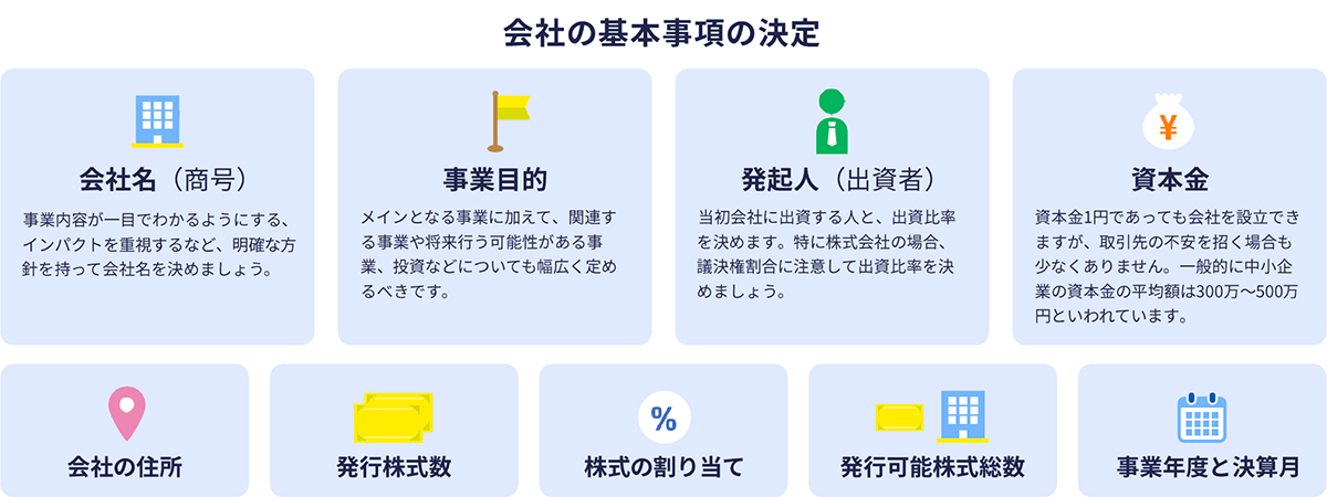 会社名や所在地、目的などの基本情報は、定款や登記にそのまま反映される重要な項目です。後から変更するには手続きが必要になるため、この段階でしっかり確認・決定しておきましょう。