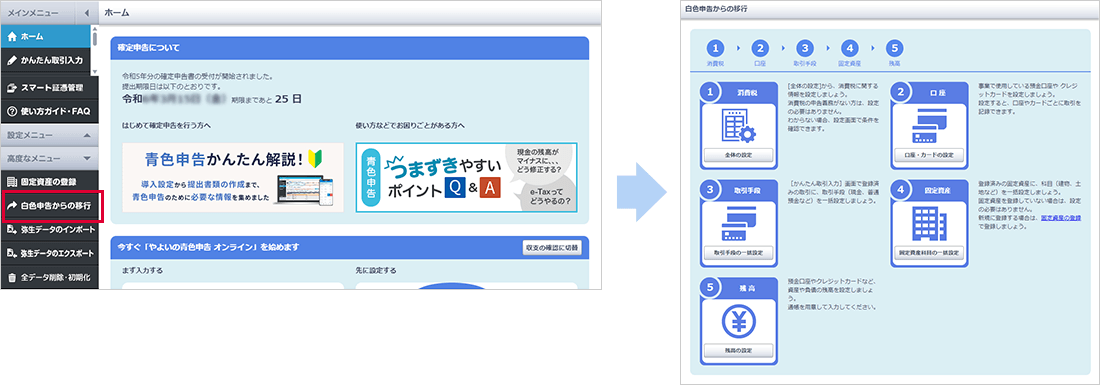 「やよいの青色申告 オンライン」にログインし、「高度なメニュー」の[白色申告からの移行]をクリックすると5つの手順が表示されます。