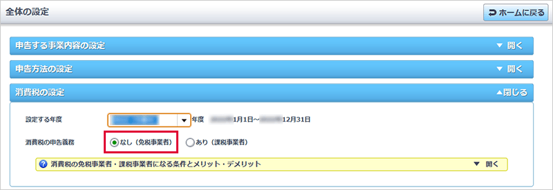 消費税の申告義務がない場合(免税事業者)は設定する必要はありません。免税事業者が初期設定されていますので、次の手順へ進んでください。