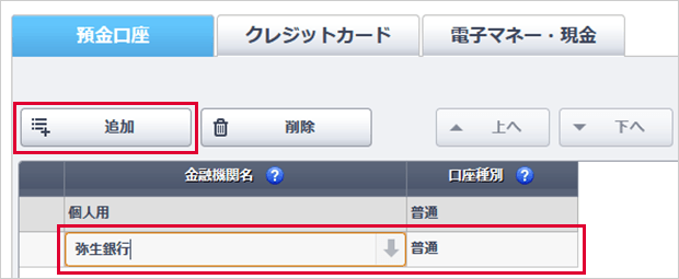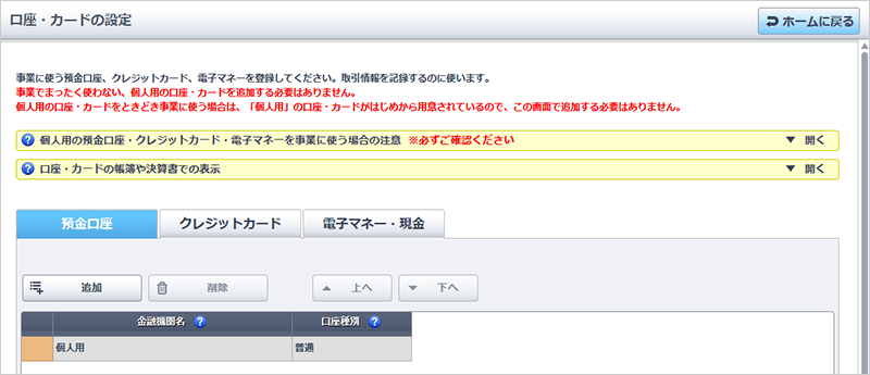 事業で使う預金口座、クレジットカード、電子マネーを登録します。ここで登録すると取引を入力するときに科目の選択肢として表示されます。