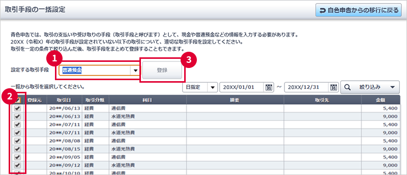 青色申告では、取引の支払いや受け取りの手段(取引手段と呼びます)として、現金や普通預金などの情報を入力する必要があります。