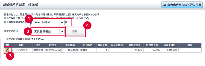 青色申告のメリット「少額減価償却資産の特例」「青色事業専従者給与」「純損失の繰越控除」を受けるための製品操作方法をご案内します。