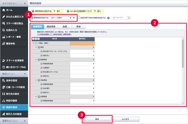 [流動資産][負債][資本]タブで期首残高を入力します。