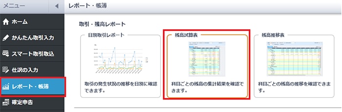 1メニューの[レポート・帳簿]から[残高試算表]をクリックします。