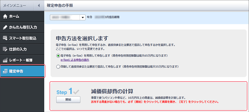 [Step1 減価償却費の計算]では、[固定資産の一覧]に登録した内容をもとに減価償却費の仕訳を自動作成します。