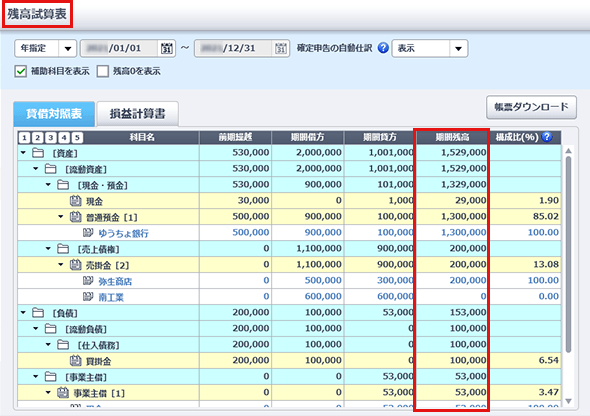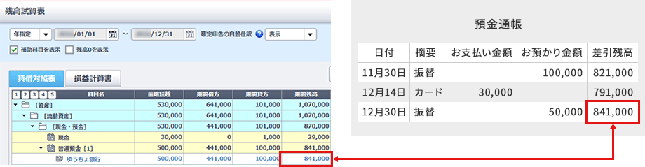 [残高試算表]で普通預金科目(もしくはその補助科目)の[期間残高]と預金通帳の12月31日(その年の最後の預金残高)が一致しているか確認します。