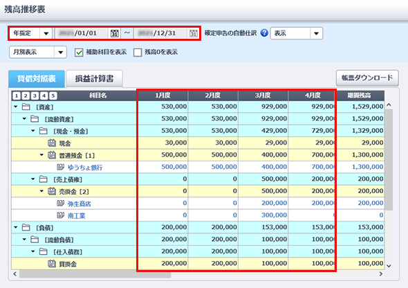 [レポート・帳簿]画面から[残高試算表]または[残高推移表]をクリックします。