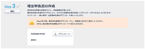 「Step3 確定申告書の作成」では、給与所得や公的年金などの事業以外の所得や、社会保険料や生命保険料、医療費、ふるさと納税などの寄附金、住宅ローン控除などの控除についての情報を入力し、確定申告書を作成します。