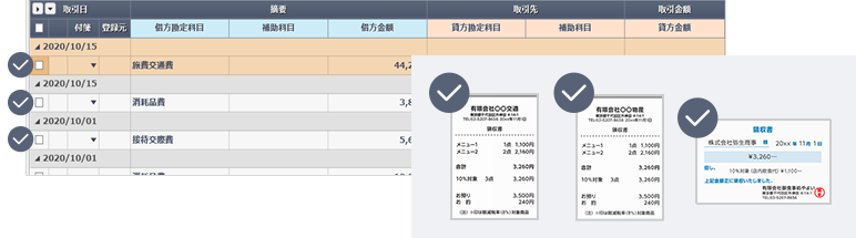 銀行明細、クレジットカードなどの取引データ、レシートや領収書のスキャンデータやスマホアプリで撮影したデータを自動仕訳するので、入力と仕訳の手間が省けます。