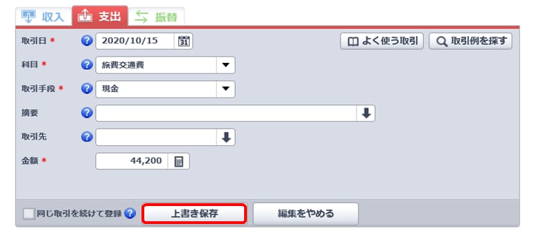 取引の修正や追加を行います。該当する取引を表示させて、正しい内容に修正して、上書き保存します。