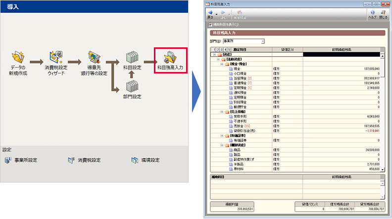 クイックナビゲータの[導入]カテゴリの[科目残高入力]をクリックして、[科目残高入力]画面を開きます。