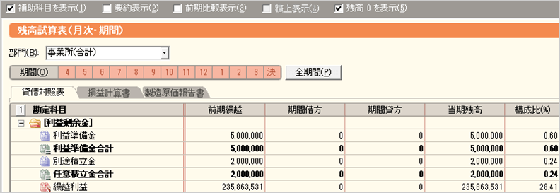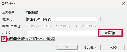 前期繰越残高(期首残高)が0の科目も出力対象にする場合は、[前期繰越残高0の科目も出力する]にチェックを付けます。