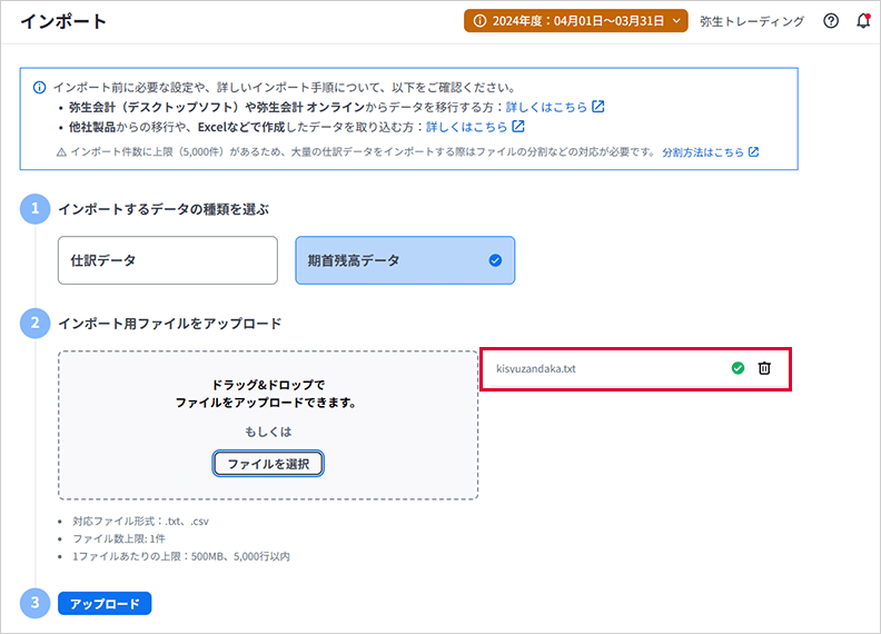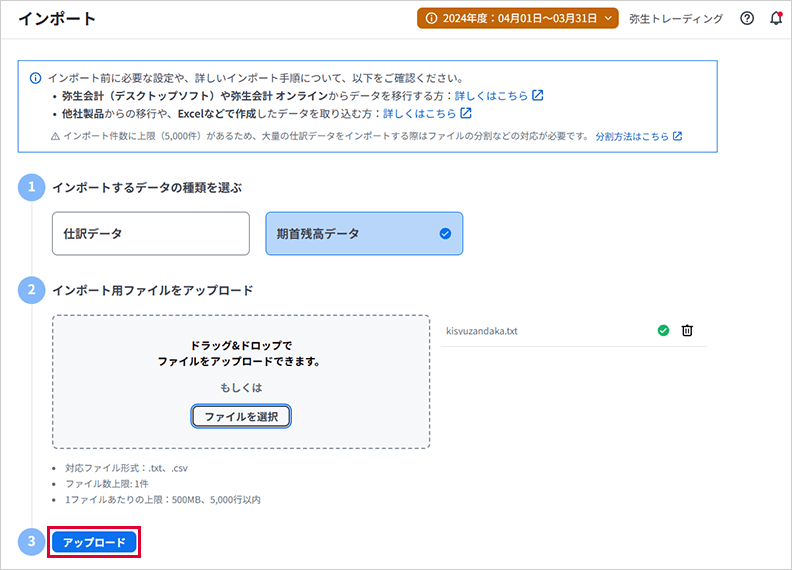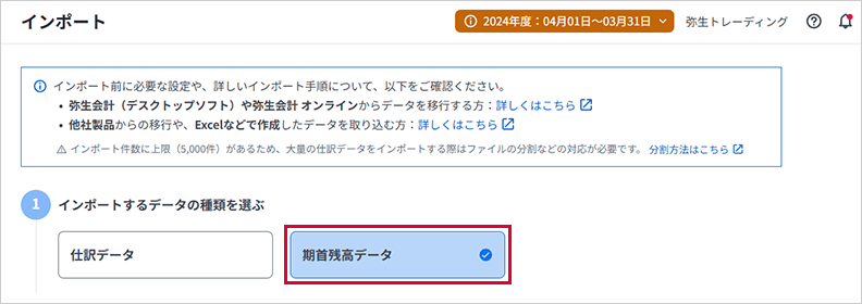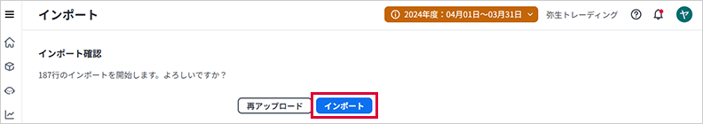 インポートデータの日付が期首日と一致していない場合、インポートできません。