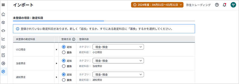 一致しない名称を弥生会計 Nextに追加するか、弥生会計 Nextの項目に置換するかを選択します。