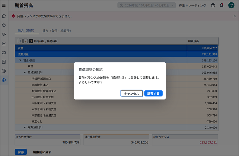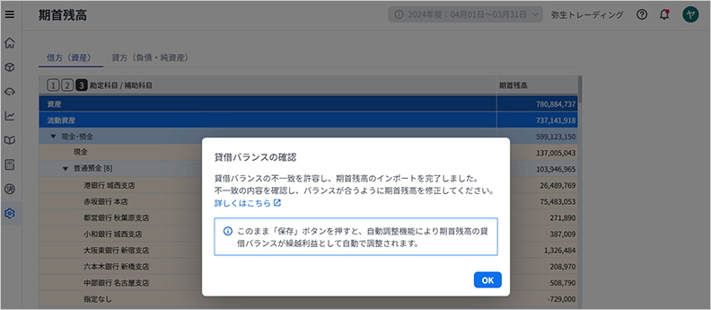 一致しない場合は、インポートデータの金額に誤りがあります。各勘定科目の期首残高とインポート元の金額を比較して、必要に応じて修正してください。