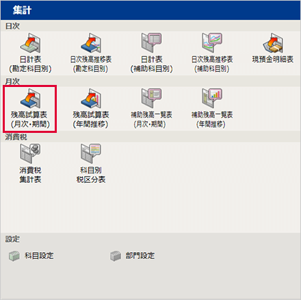 クイックナビゲータの[集計]カテゴリの[残高試算表(月次・期間)]をクリックして、[残高試算表]画面を開きます。