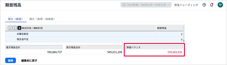 「貸借バランス」の金額が、[借方(負債・純資産)]タブの「繰越利益」科目の期首残高に反映されます。