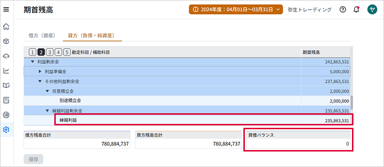 貸借バランスの数値が繰越利益と一致しているかを確認します。