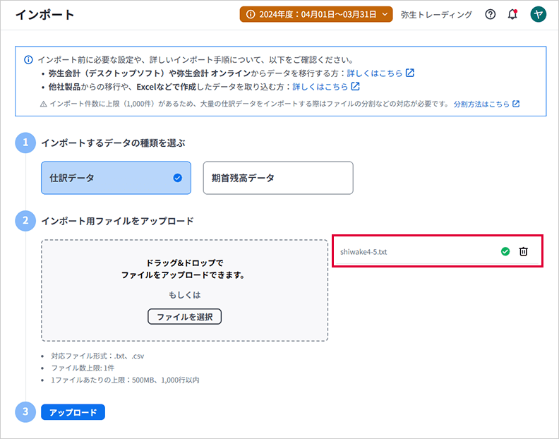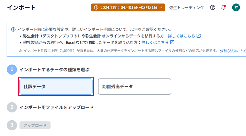 ②1,000行を超えるデータは弥生会計 Nextにインポートできません。1,000行を超えている場合は、分割して複数回に分けてエクスポートしてください。