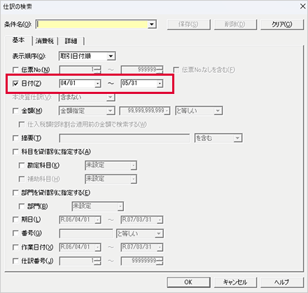 日付欄で期間を指定して、[OK]をクリックします。