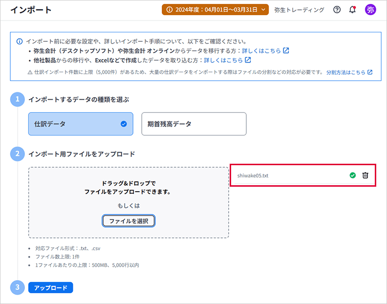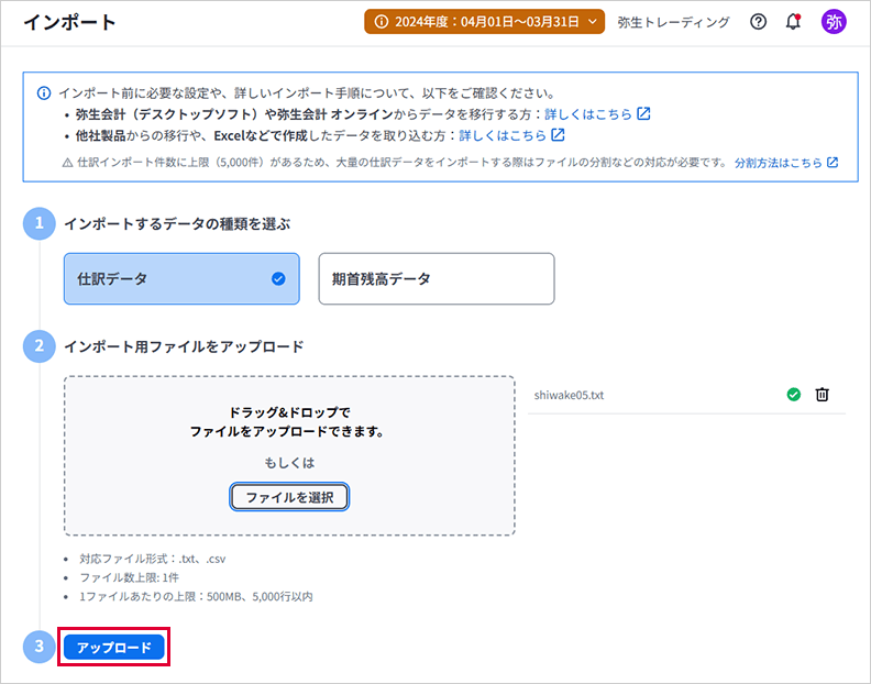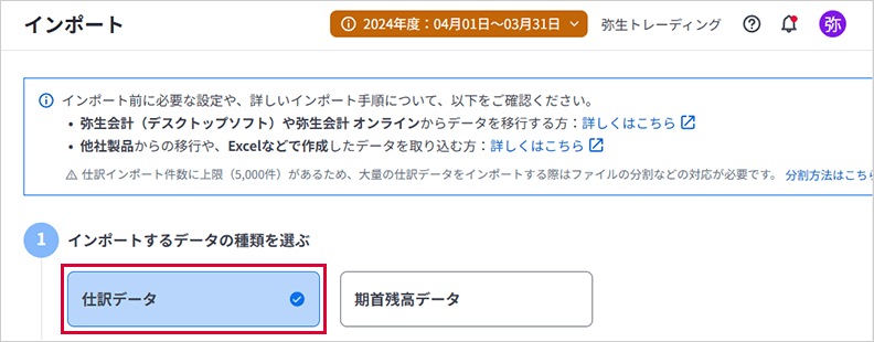 ②5,000行を超えるデータは弥生会計 Nextにインポートできません。5,000行を超えている場合は、分割して複数回に分けてエクスポートしてください。