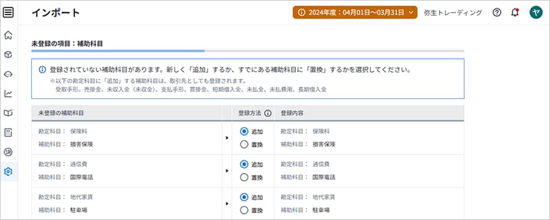 一致しない名称を弥生会計 Nextに追加するか、弥生会計 Nextの項目に置換するかを選択します。