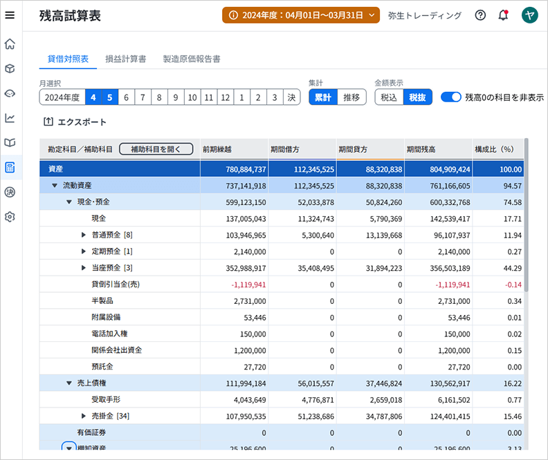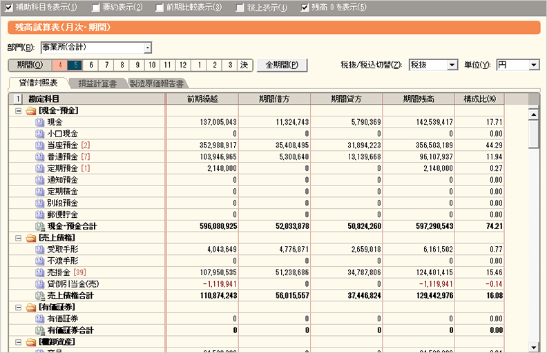 クイックナビゲータの[集計]カテゴリの[残高試算表(月次・期間)]をクリックして、[残高試算表]画面を開きます。