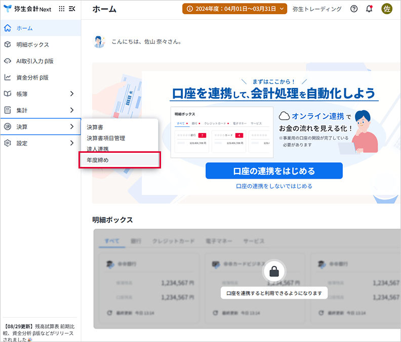 また、左メニューの決算から、「年度締め」をクリックし、前年度データをロックします。ロックしたデータを編集する場合は解除可能です。