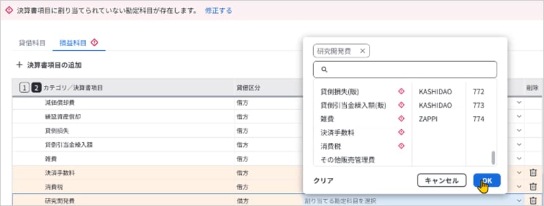 決算書項目に割り当てられていない勘定科目がある場合は、割り当てを行ってください。