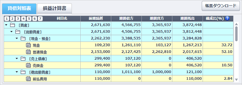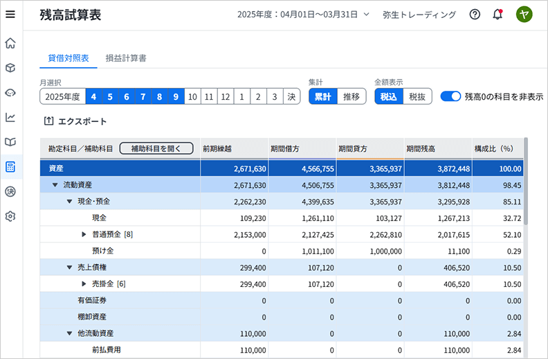 残高試算表を開き、インポートした期間を選択します。