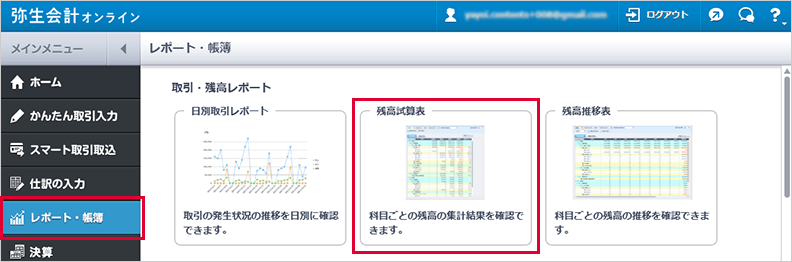 [レポート・帳簿]をクリックして、[残高試算表]を選択します。