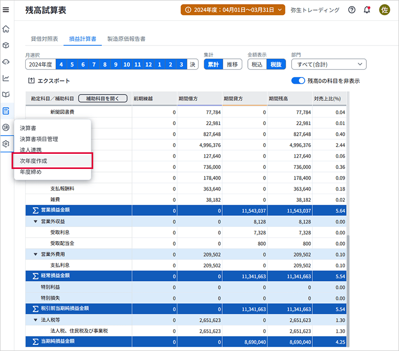 今年度の仕訳を弥生会計 オンラインに入力している場合は、そちらもエクスポート▶弥生会計 Nextにインポート▶残高試算表を確認します。