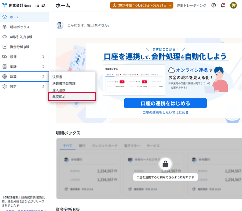 また、左メニューの決算から、「年度締め」をクリックし、前年度データをロックします。ロックしたデータを編集する場合は解除可能です。