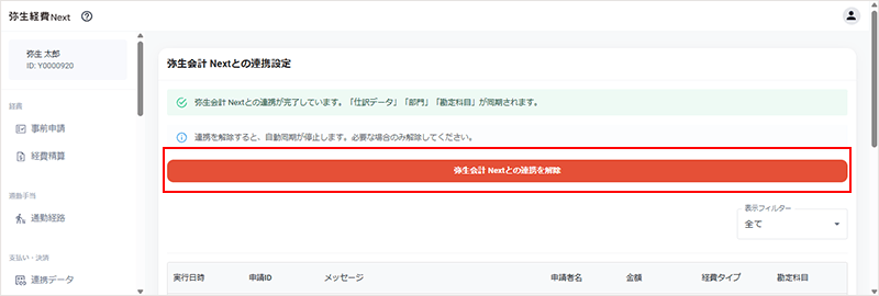 画面上部に「弥生会計 Nextとの連携が完了しています。」と記載されていれば連携完了です。