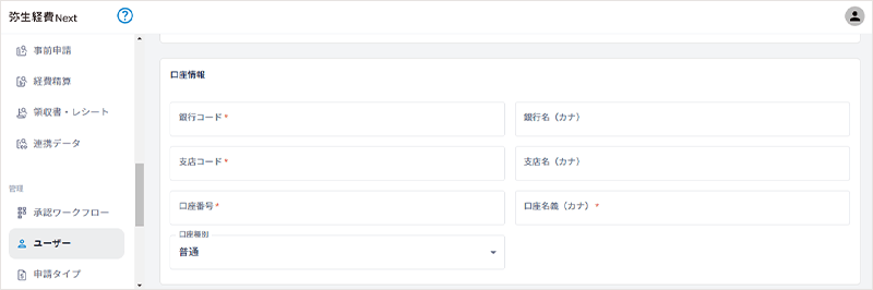 「弥生経費 Next」では、振込先である従業員の銀行口座と振込元である企業口座の設定を行うことで、経費精算の従業員立替金の振込データ作成が行えます。