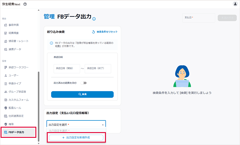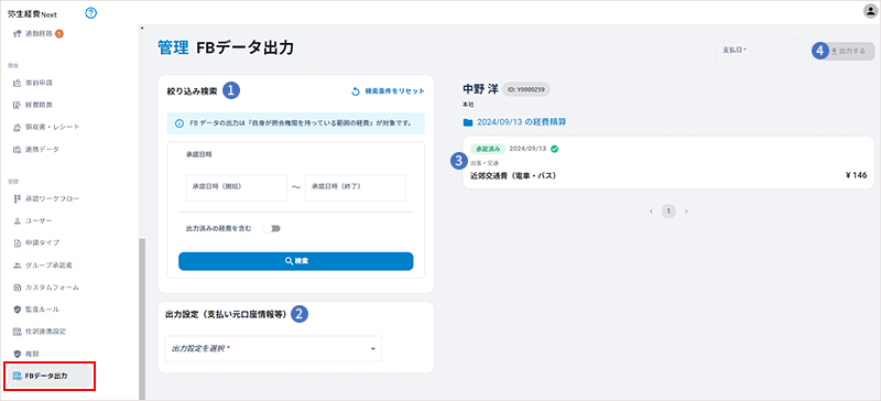 承認済みの経費のうち、指定された条件(承認日)に基づき、FBデータを抽出します。