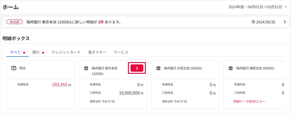 明細ボックスに明細が取り込まれたら、ホーム画面のToDoリスト、明細ボックスにお知らせが表示されます。
