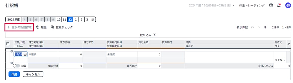 仕訳帳から新しい仕訳を作成する場合は「仕訳の新規作成」をクリックします。