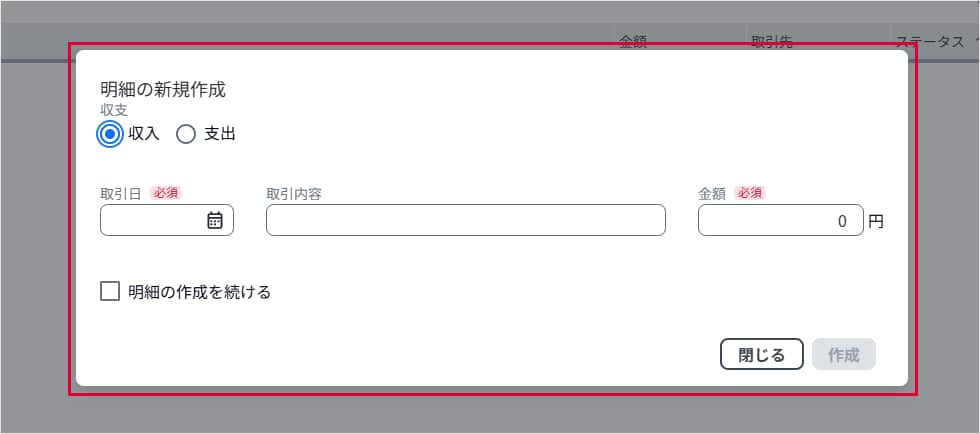 「収入」または「支出」を選び、取引日・取引内容・金額を入力し「作成」ボタンをクリックします。