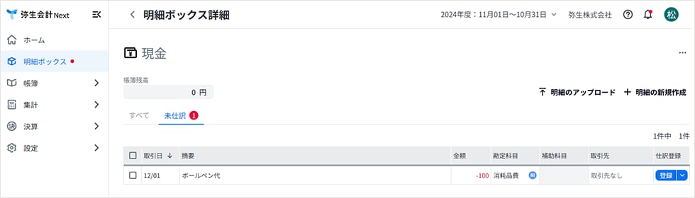 「弥生会計 Next」では、明細ボックスに取り込まれた明細から仕訳を登録することができます。
