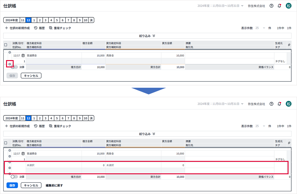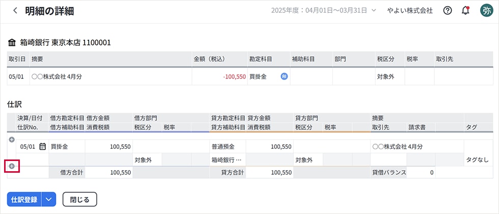 複合仕訳に修正する場合は「+」ボタンをクリックすると、行追加が行えます。