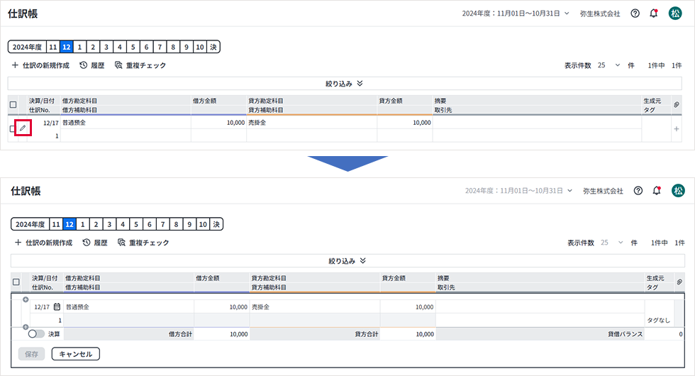 修正したい仕訳の鉛筆マークをクリックすると、仕訳を編集することができます。
